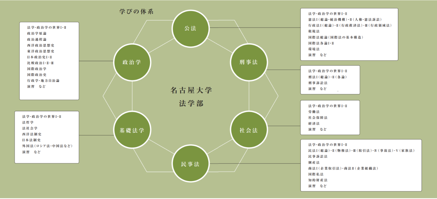 名大法学部では、法と政治を自由に学ぶことができます。授業は大きく6 つの分野に整理されます。